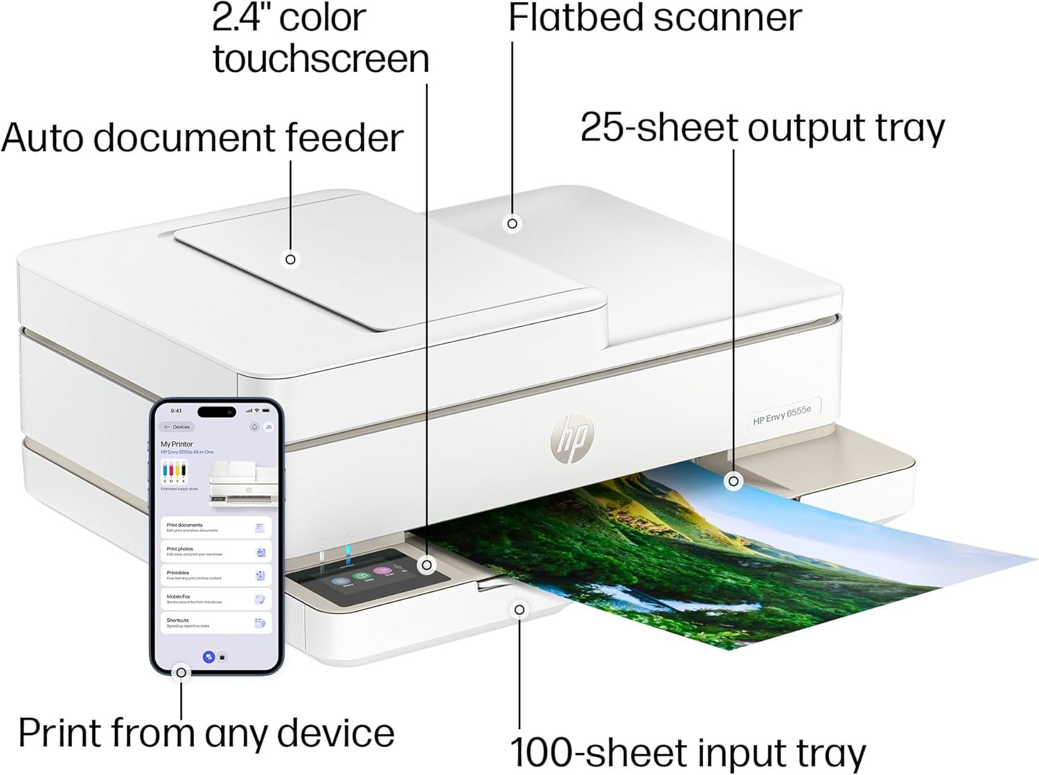 • The HP Envy 6555e All-in-One delivers color printing, scanning and copying, plus a 35-sheet auto document feeder and 100-sheet paper capacity. It includes wireless and mobile printing capabilities to keep your multifunction printer connected, and prints high-quality documents and photos every time with true-to-screen tech. This inkjet printer also lets you easily navigate print jobs with its intuitive color touchscreen.